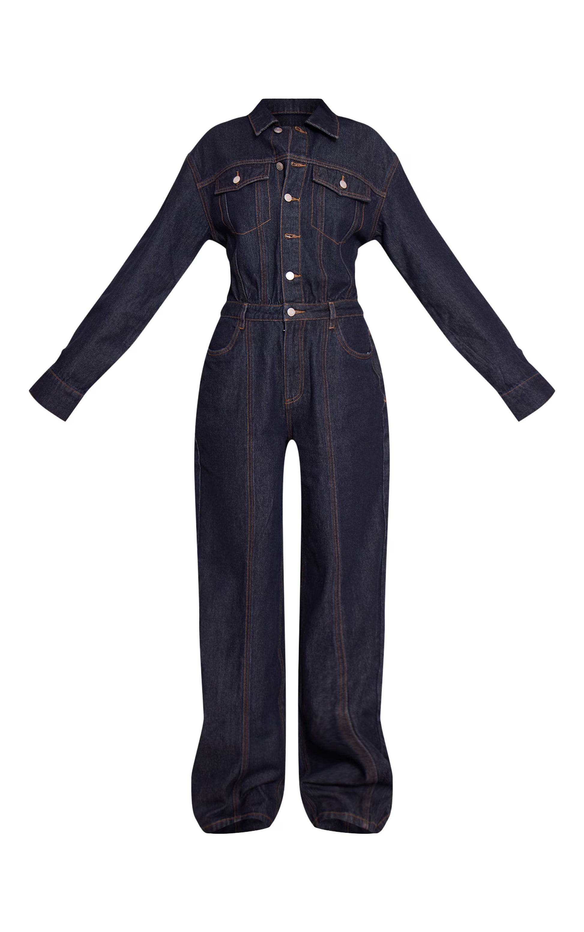 Master the art of effortless dressing in one bold move. The Indigo Contrast Stitch Long Sleeve Denim Jumpsuit offers a fresh take on one-and-done styling, defined by its classic collared neckline and long sleeves with buttoned cuffs. A deep indigo wash is highlighted with prominent tan contrast stitching, detailing the chest flap pockets and the contemporary wide-leg cut that falls from a subtly cinched waist. For an elevated day look, style this essential piece with sleek closed toe heels and a pair of delicate gold earrings, perfectly navigating your schedule with confidence.