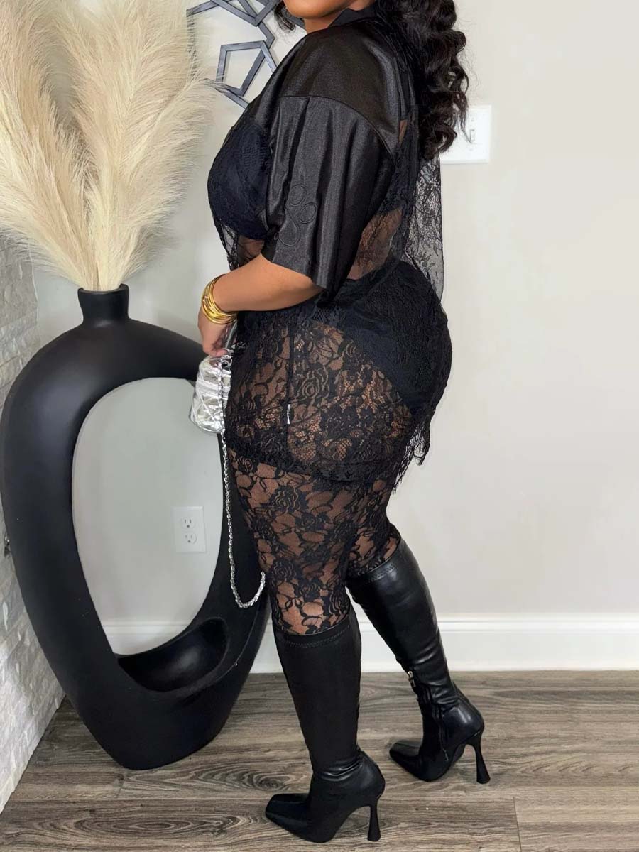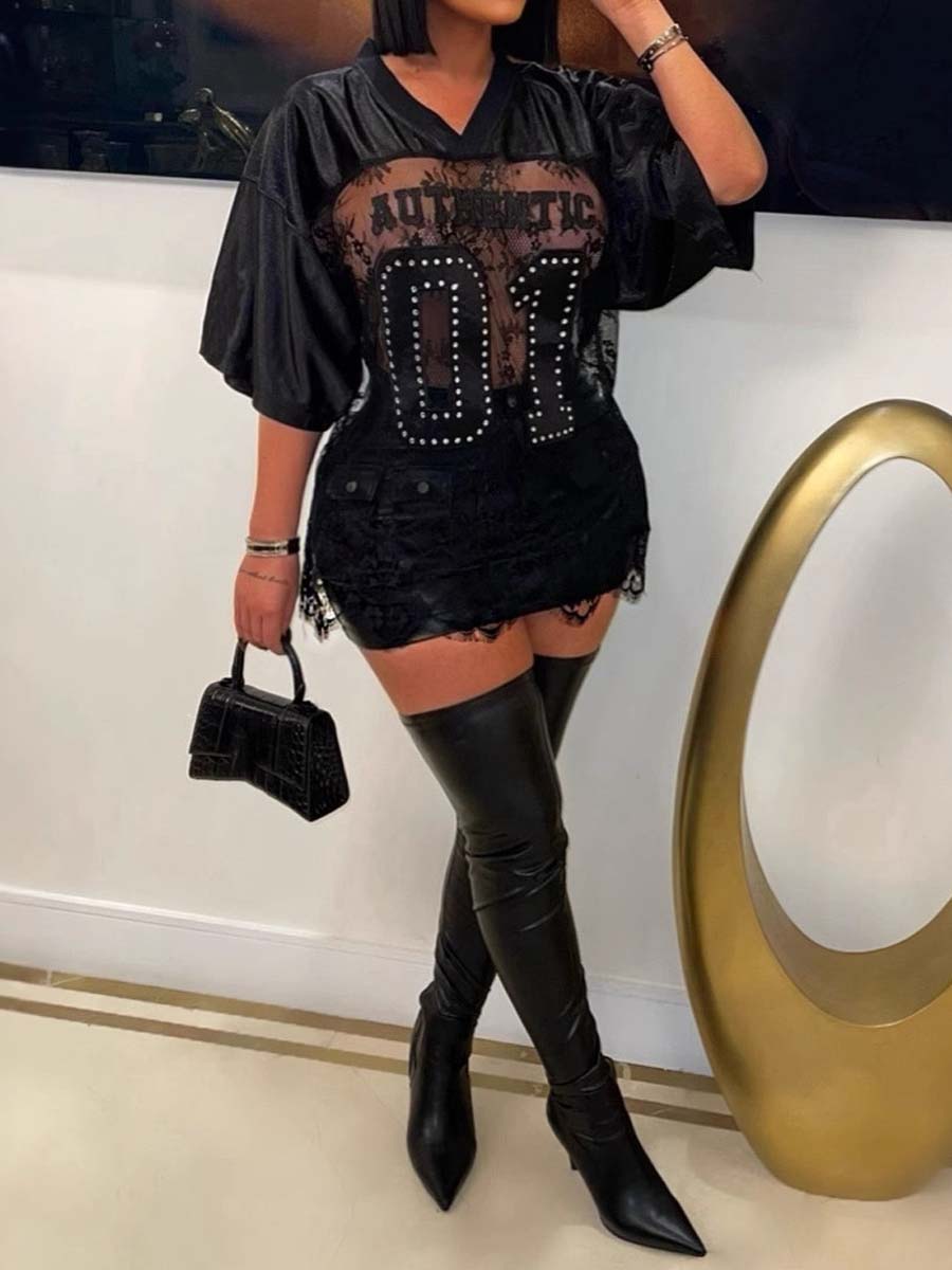 Printed Loose Casual Sexy Lace Patchwork T-shirt