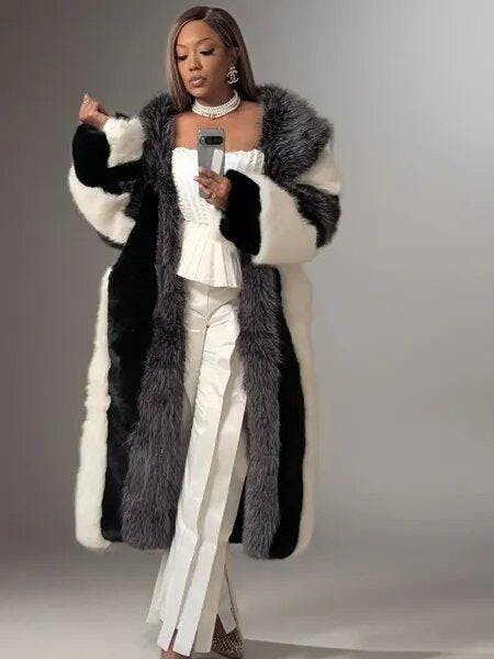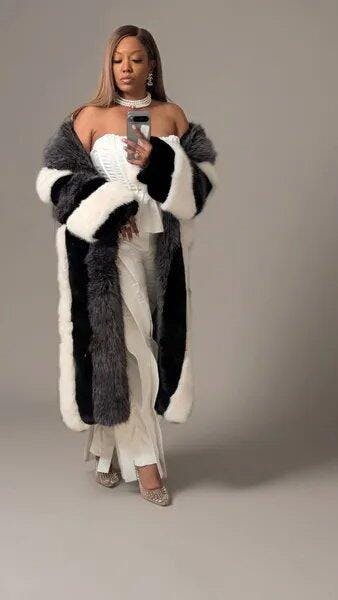 Look fabulous in fur. Want It All Faux Fur is crafted from luxurious, ultra-fluffy faux fur with a color block, paneled design. It boasts an oversized collar, long sleeves, concealed hook-and-eye front closures, dual waist pockets, and a satin inner lining. Complete with an extravagant, longline silhouette.
