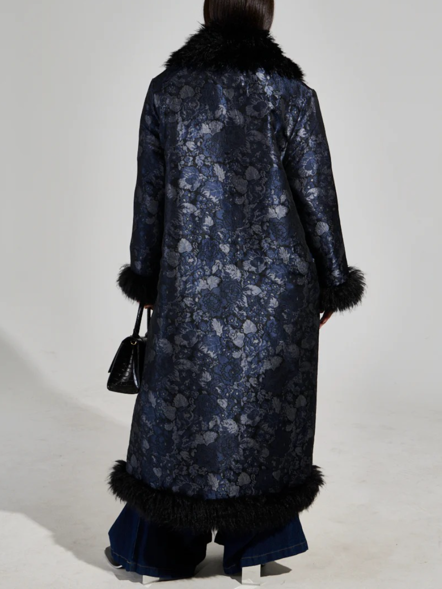 This fabulous full-length coat is crafted from a non-stretch brocade fabrication and boasts a baroque floral pattern throughout, a wide, shaggy mohair collar, long sleeves with coordinating mohair cuffs, spacious side seam pockets, and a slick, quilted interior to keep you extra snug. Complete with mohair trim at the hem and a hook and eye front closure.
